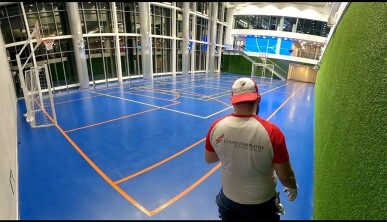 Практика обновления покрытия пола: очистка Forbo 891 и нанесение Forbo 898 для восстановления спортивных поверхностей.