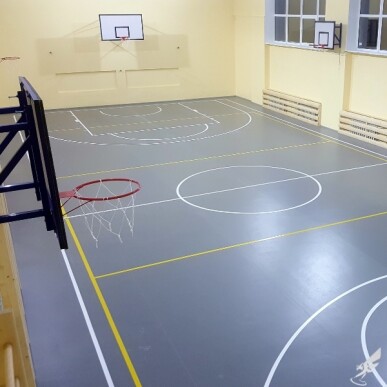 Разметка наносится на уже подготовленное и очищенное покрытие. Это может быть спортивный линолеум, паркет или другие виды твердых покрытий.